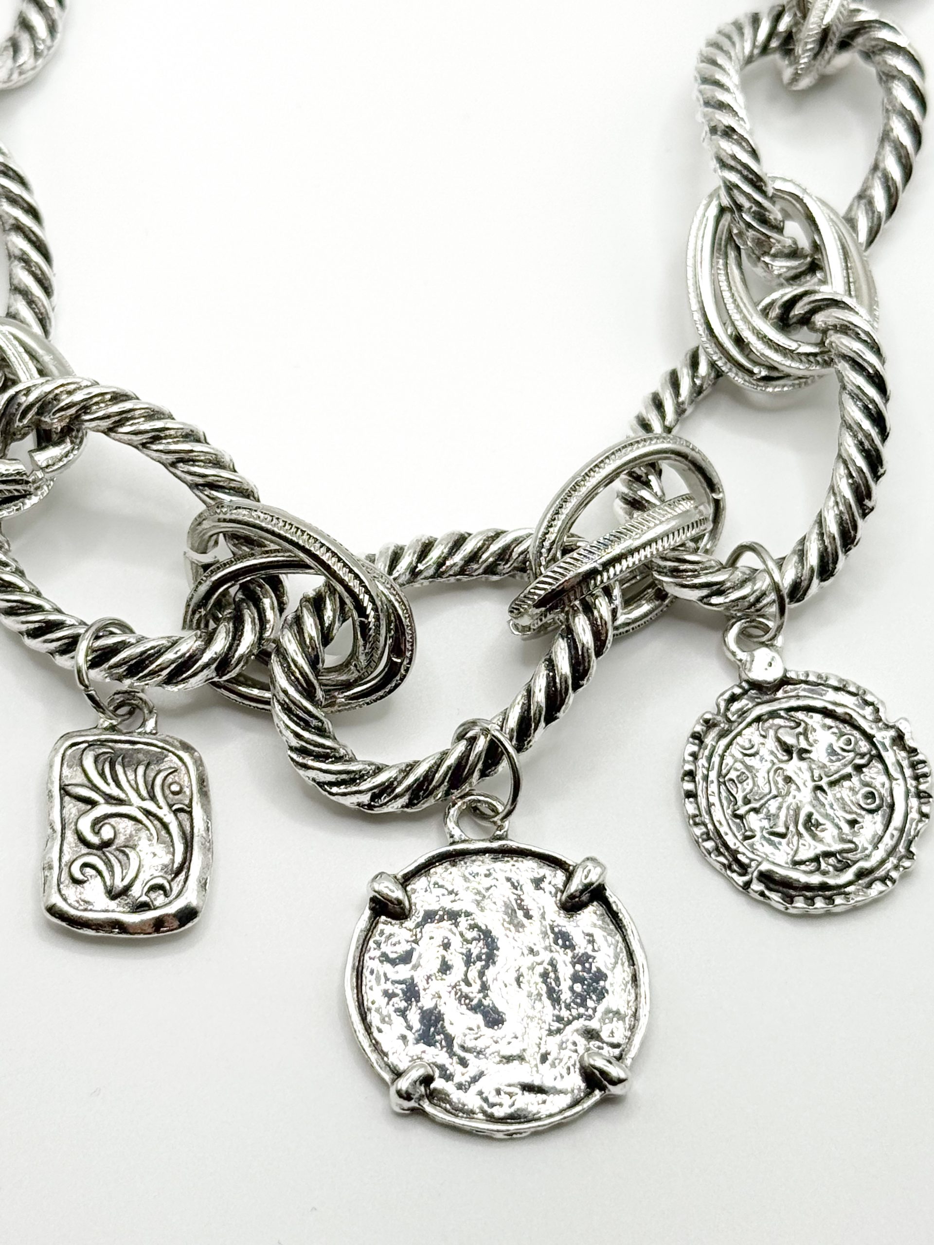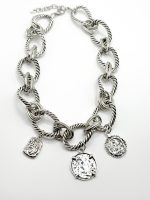 Ένα εντυπωσιακό ατσάλινο κολιέ με chunky αλυσίδα και κρεμαστά charms σε αρχαϊκό στυλ νομισμάτων. Το ιδιαίτερο design του χαρίζει bold χαρακτήρα και vintage αισθητική, ιδανικό για να αναβαθμίσει κάθε σου εμφάνιση. Φτιαγμένο από ανοξείδωτο ατσάλι για αντοχή και στυλ που διαρκεί, μπορείς να το φορέσεις μόνο του ή να το συνδυάσεις με άλλα κολιέ για layered look.