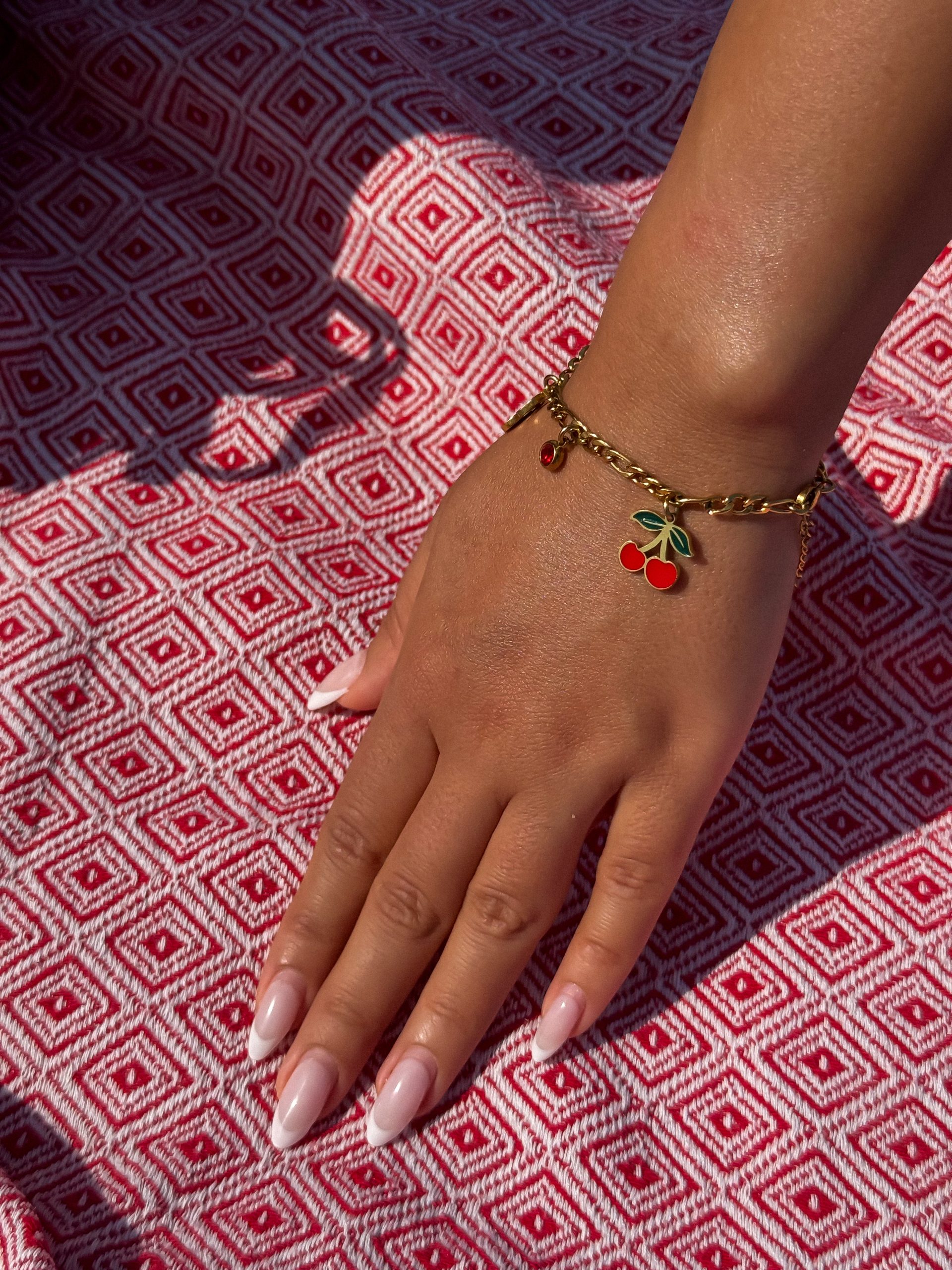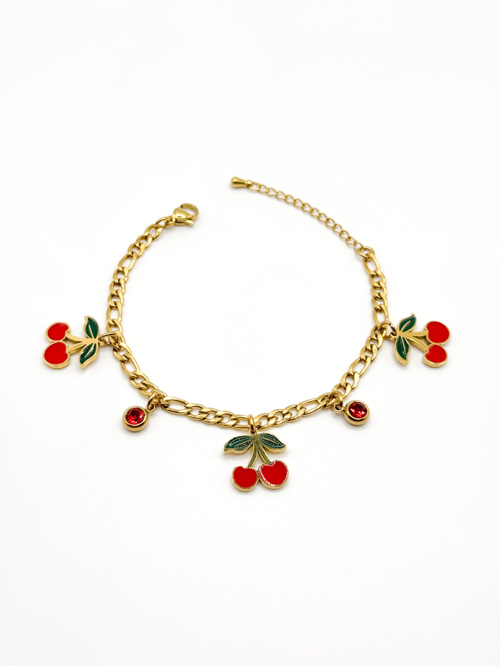 Χρυσό βραχιόλι με χαριτωμένα κερασάκια και κόκκινες λεπτομέρειες. Απόλυτα καλοκαιρινό και παιχνιδιάρικο!