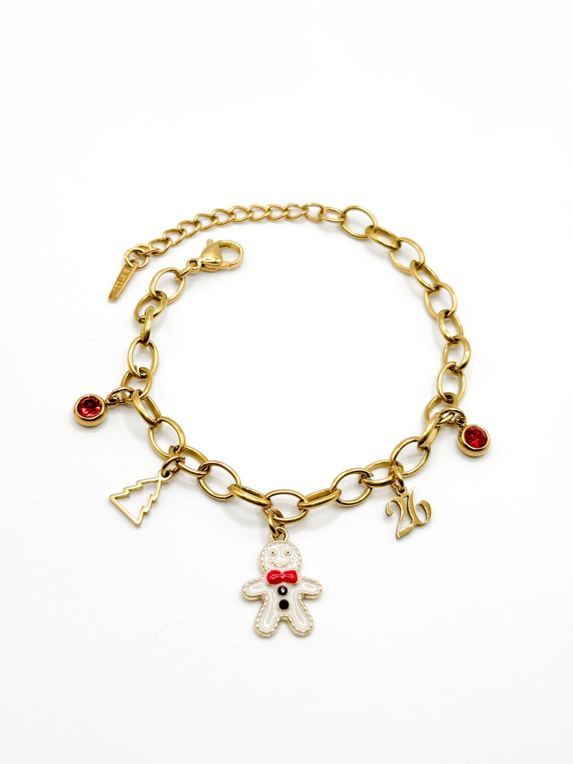 Γιορτινό χρυσό charm bracelet με χριστουγεννιάτικα κρεμαστά στοιχεία: gingerbread, δεντράκι, αριθμό και κόκκινες πέτρες. Ένα παιχνιδιάρικο και χαρούμενο κόσμημα, ιδανικό για δώρο και για να δώσει χριστουγεννιάτικη διάθεση σε κάθε look.