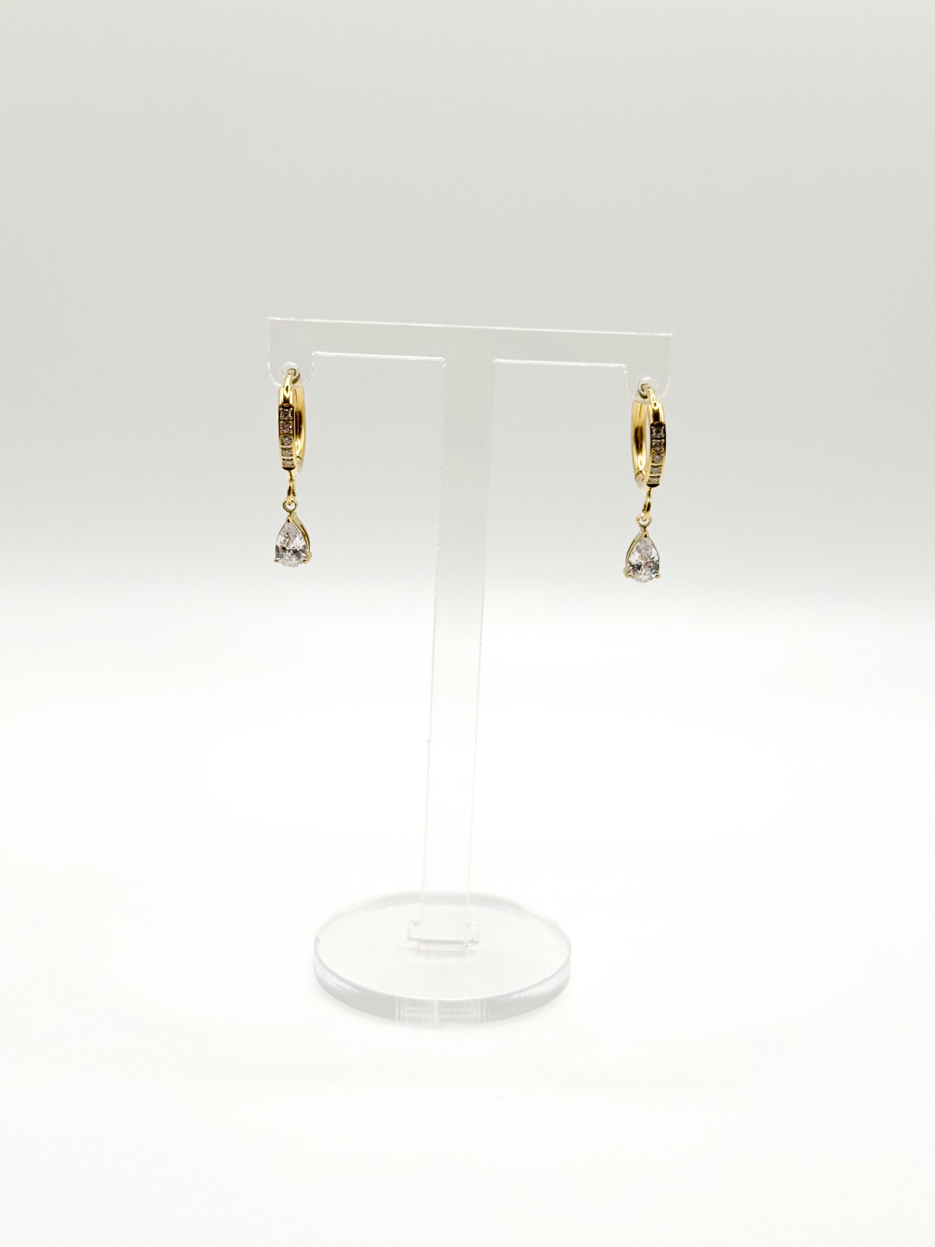 Χρυσά κρεμαστά σκουλαρίκια από ανοξείδωτο ατσάλι με εντυπωσιακή pear-shaped ζιργκόν πέτρα. Ο κρίκος διαθέτει μικρά λευκά ζιργκόν για επιπλέον λάμψη, ενώ το κρεμαστό δάκρυ προσθέτει κομψότητα και κίνηση σε κάθε εμφάνιση. Ιδανικά για καθημερινό chic look, αλλά και για πιο ιδιαίτερες περιστάσεις, χάρη στο διακριτικό αλλά λαμπερό τους design. Ανθεκτικά, υποαλλεργικά και κατάλληλα για πολύωρη χρήση.