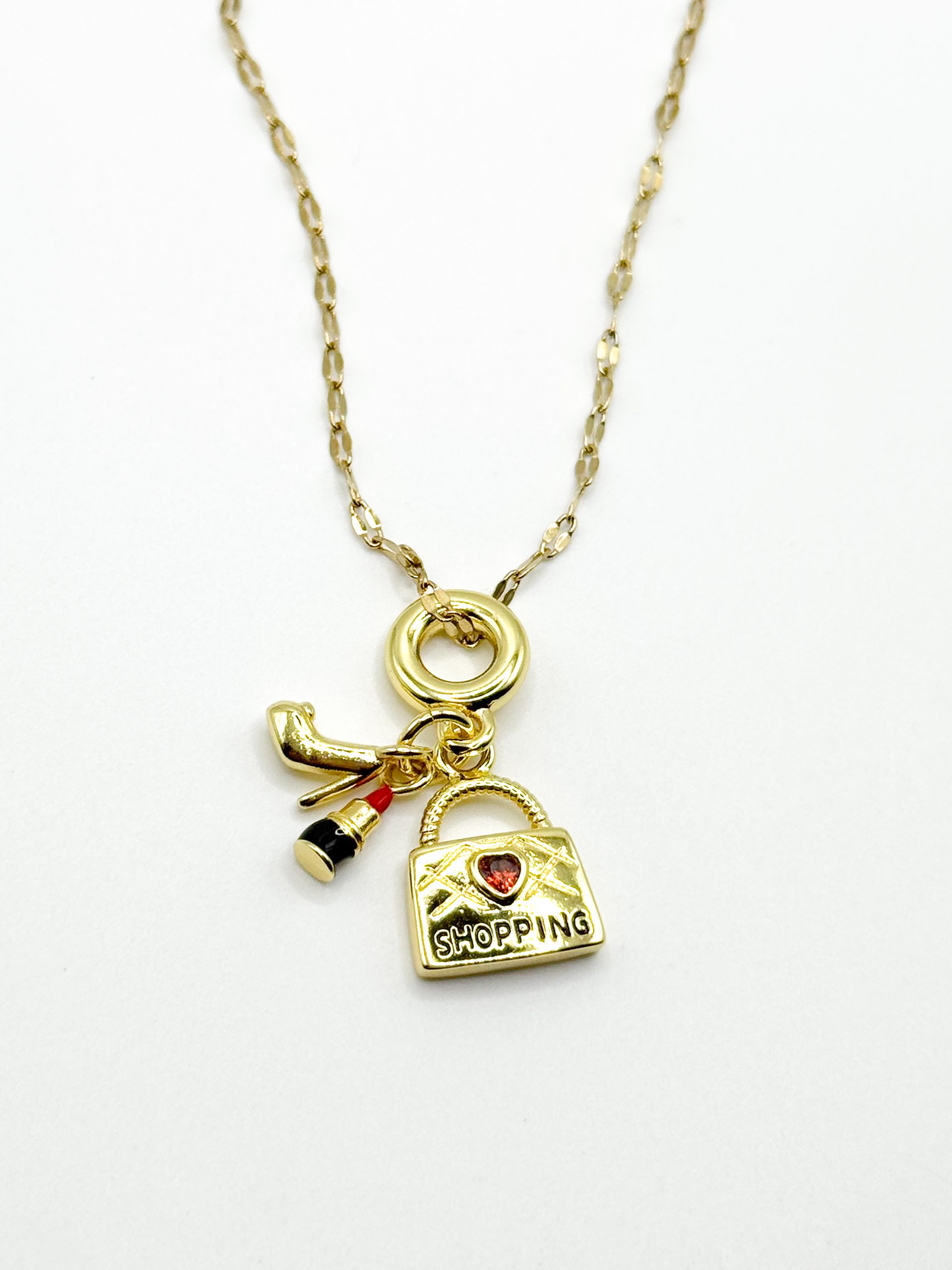 Μοντέρνο χρυσό κολιέ με διασκεδαστικά charms: τσάντα με χαραγμένο το “shopping”, κραγιόν και γόβα στιλέτο. Ένα παιχνιδιάρικο και στιλάτο κόσμημα που εκφράζει την αγάπη για τη μόδα και το shopping. Ιδανικό για fashionistas που θέλουν να δώσουν μια μοναδική πινελιά στις εμφανίσεις τους. Ελαφρύ, ευκολοφόρετο και τέλειο για δώρο σε φίλη ή αγαπημένο πρόσωπο.
