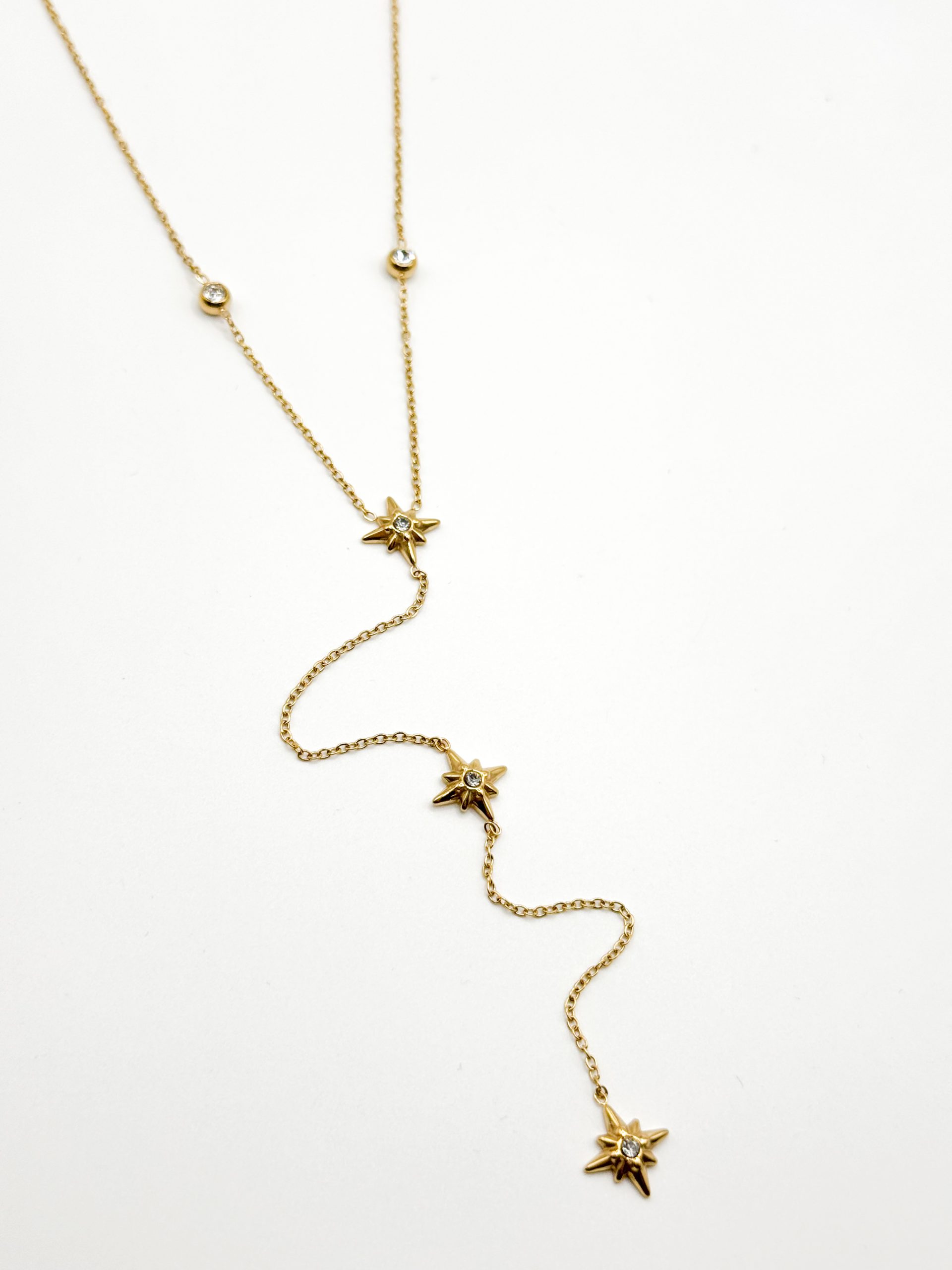 Λεπτεπίλεπτο χρυσό κολιέ με αστεράκια, σχεδιασμένο σε cascading στιλ που πέφτει όμορφα στο ντεκολτέ. Τα μικρά λευκά ζιργκόν χαρίζουν διακριτική λάμψη, κάνοντάς το ιδανικό για καθημερινές αλλά και πιο ιδιαίτερες εμφανίσεις. Ένα ρομαντικό και κομψό κόσμημα που φωτίζει το λαιμό και ταιριάζει τέλεια σε layering συνδυασμούς.