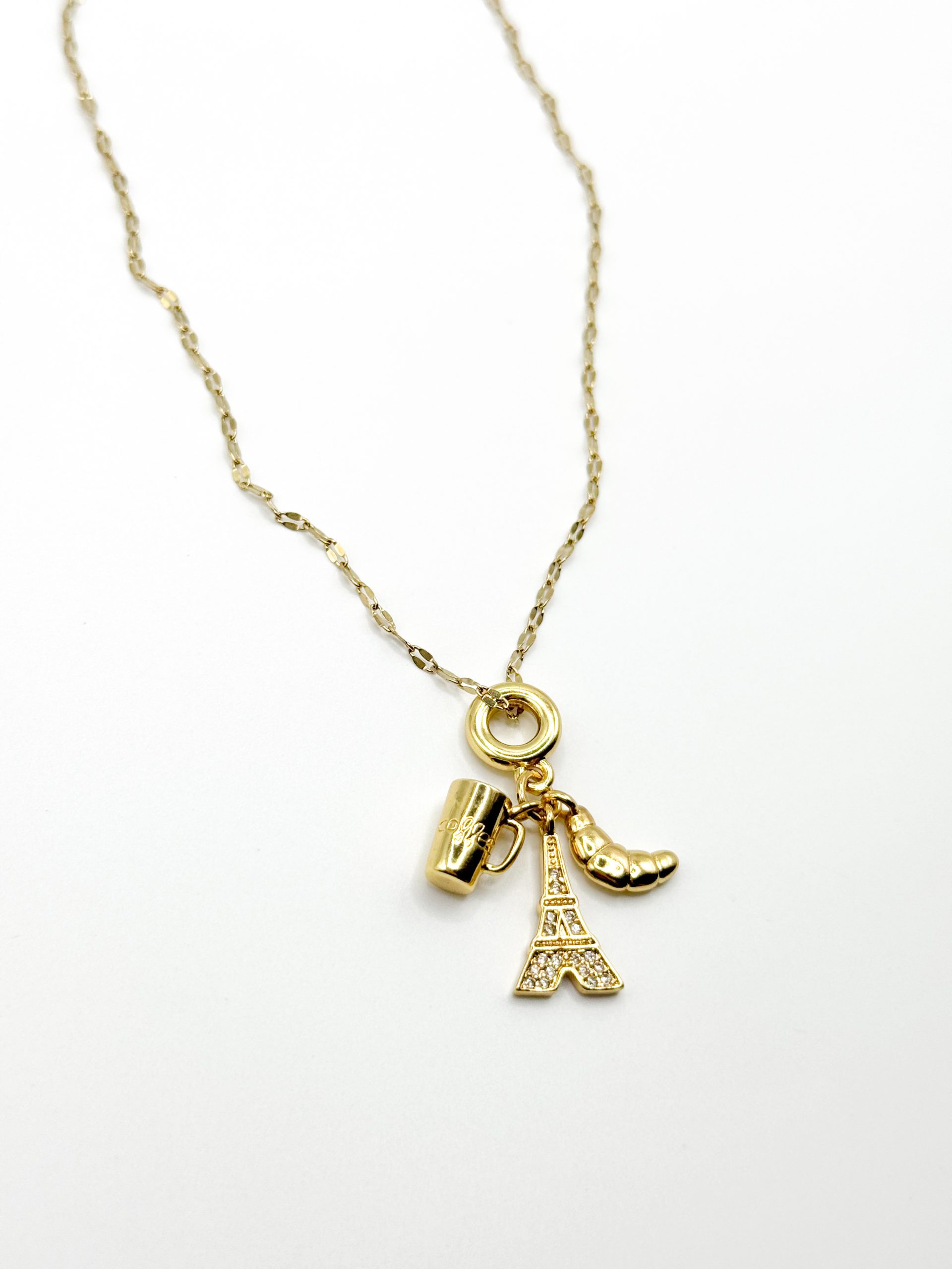 Ρομαντικό χρυσό κολιέ με charms εμπνευσμένα από το Παρίσι: τον Πύργο του Άιφελ, ένα stylish μποτάκι και ένα μικρό ποτήρι καφέ. Ένα playful και κομψό κόσμημα που φέρνει τη γαλλική φινέτσα σε κάθε σας εμφάνιση.
