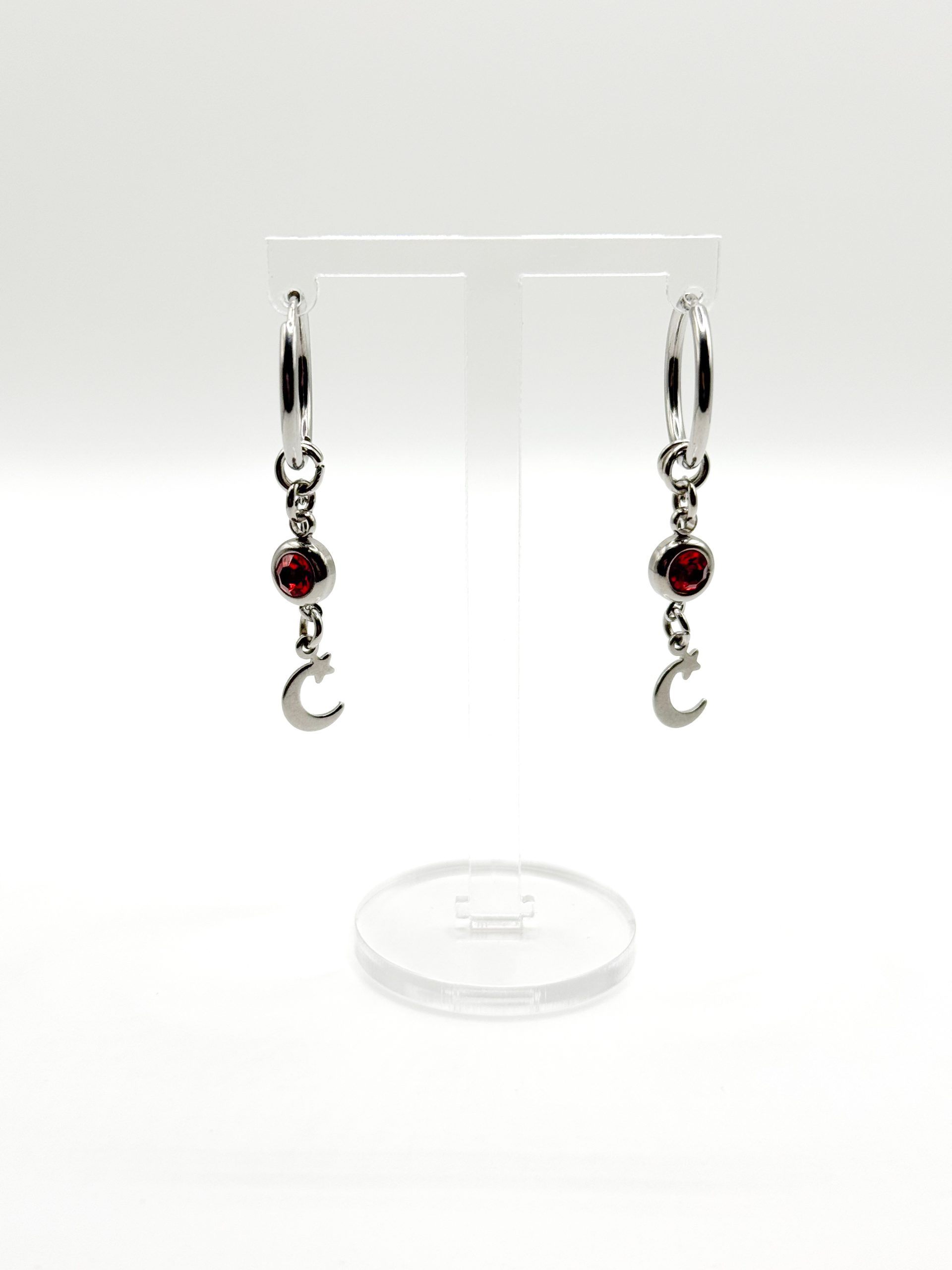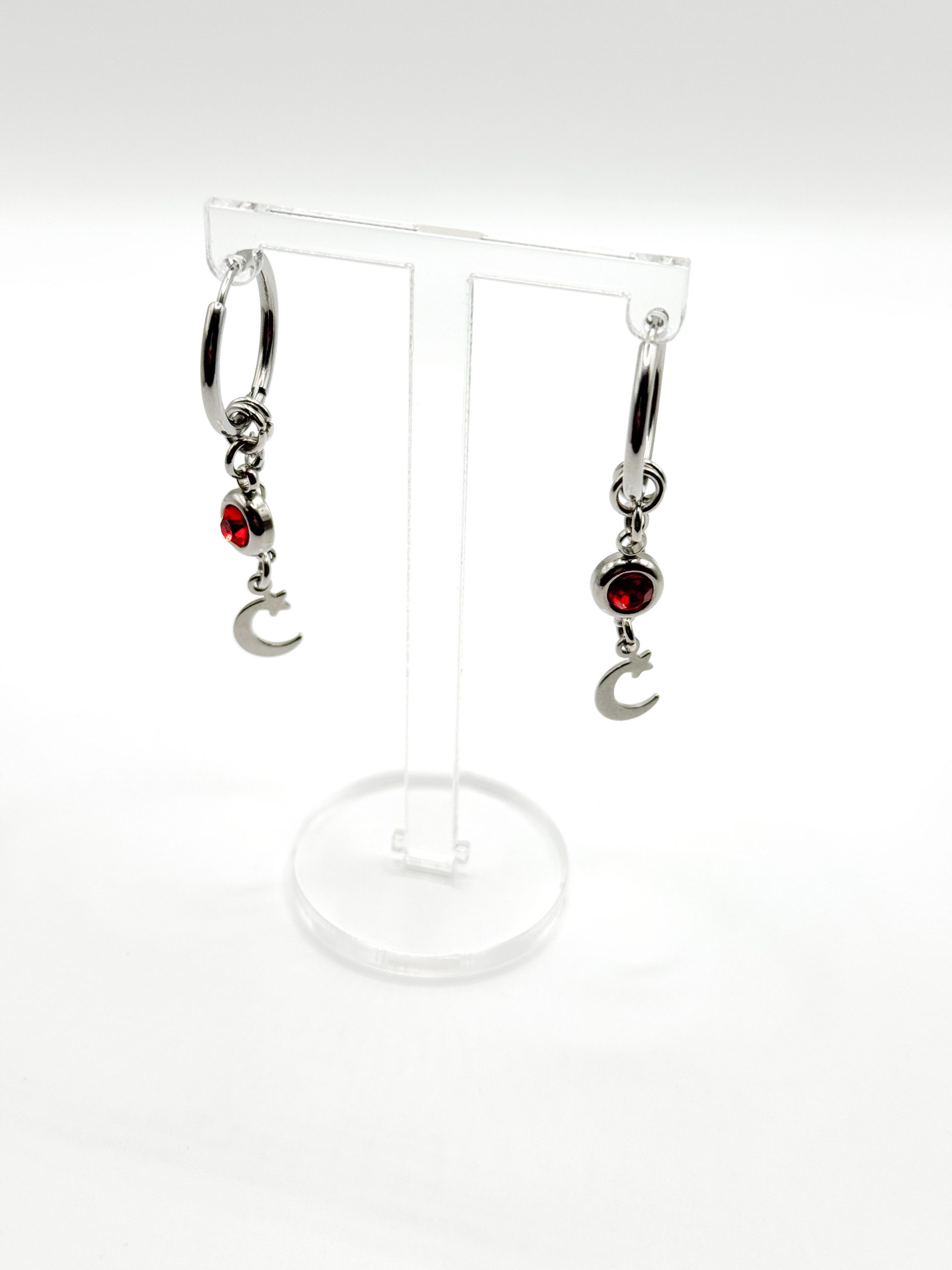 Τα silver moon drop earrings with red crystal είναι ένα κομψό και μοντέρνο ζευγάρι κρίκων με διακοσμητικό κόκκινο κρύσταλλο και μικρή μεταλλική σελήνη που κρέμεται απαλά. Ο μίνιμαλ σχεδιασμός τους σε ασημί τόνο τα κάνει ιδανικά για καθημερινή χρήση, ενώ η κόκκινη λεπτομέρεια προσθέτει μια διακριτική, λαμπερή πινελιά στο στυλ σας. Ελαφριά, άνετα και ευκολοφόρετα, ταιριάζουν με κάθε look, από casual μέχρι πιο ιδιαίτερες εμφανίσεις.