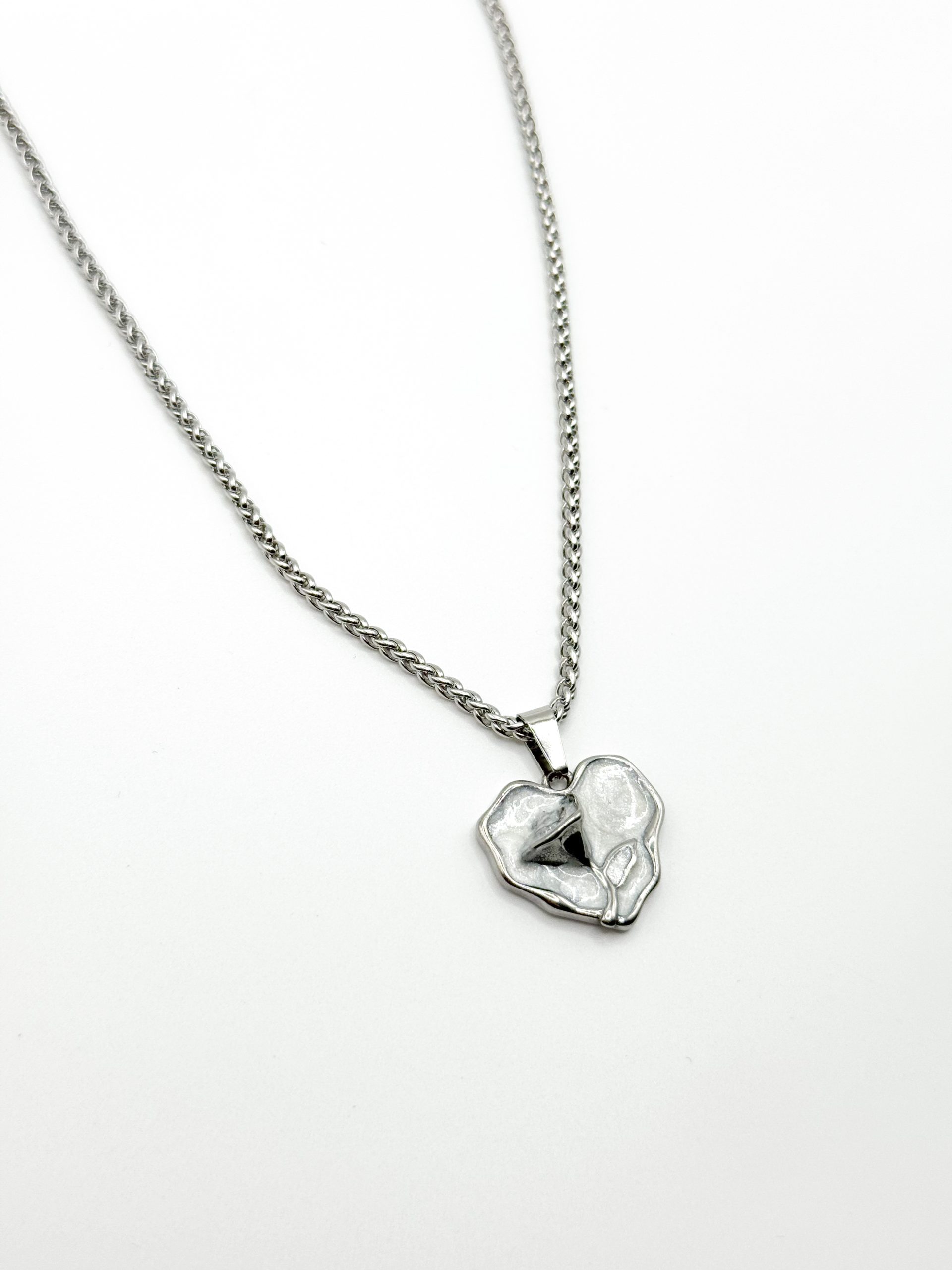 Κομψό ασημί κολιέ με ιδιαίτερη αλυσίδα και μοναδικό μενταγιόν σε σχήμα αφηρημένης καρδιάς με λευκό σμάλτο. Ο μοντέρνος σχεδιασμός του αποπνέει καλλιτεχνική διάθεση και συμβολίζει την αγάπη με έναν πρωτότυπο και διαφορετικό τρόπο. Ιδανικό για όσες αγαπούν τα statement κοσμήματα και θέλουν να ξεχωρίζουν σε κάθε εμφάνιση.