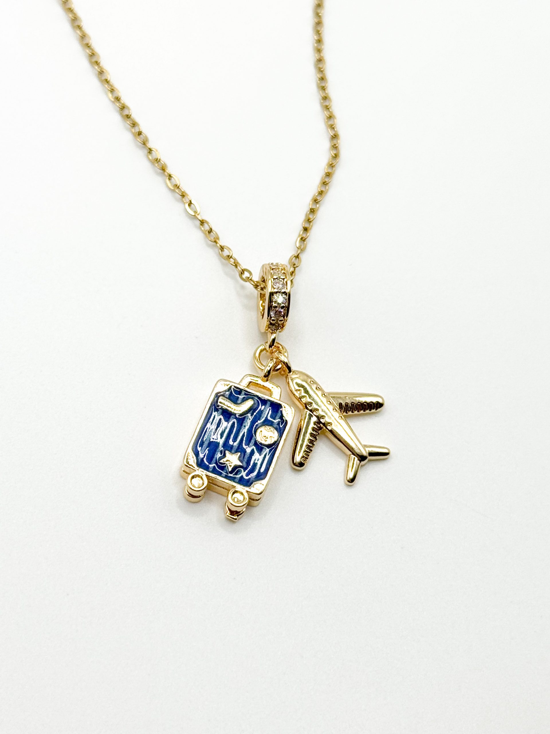 Χρυσό κολιέ από ανοξείδωτο ατσάλι με χαριτωμένα κρεμαστά charms βαλίτσα και αεροπλανάκι. Ένα παιχνιδιάρικο κόσμημα που αποπνέει ταξιδιωτική διάθεση και θετική ενέργεια, ιδανικό για όσους αγαπούν τα ταξίδια και θέλουν να τα έχουν πάντα μαζί τους. Φτιαγμένο από ανθεκτικό ατσάλι που δεν μαυρίζει, μπορείς να το φορέσεις καθημερινά και να το συνδυάσεις εύκολα με άλλα κολιέ για ένα ξεχωριστό look.