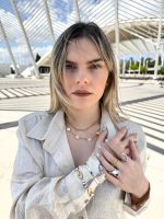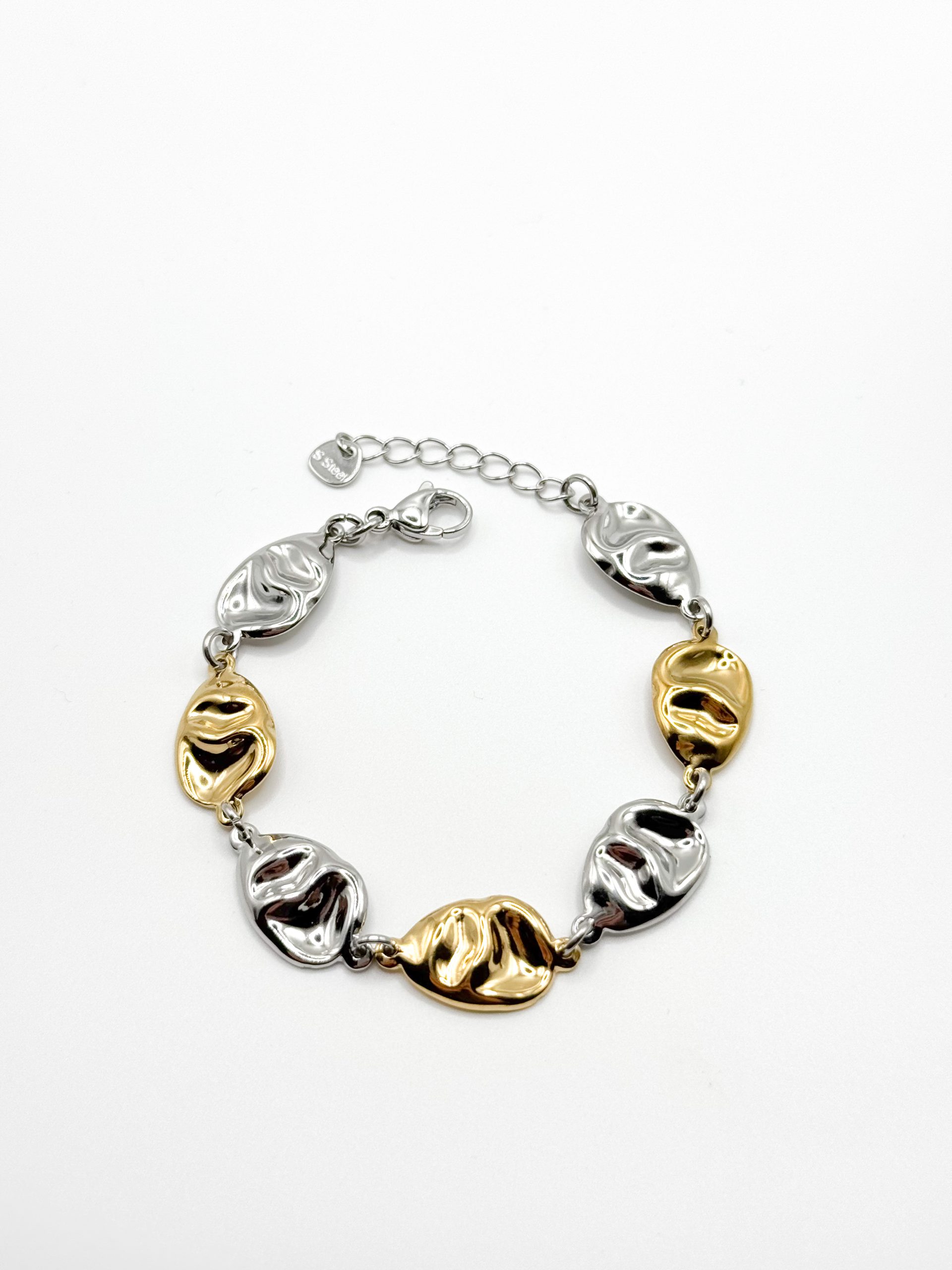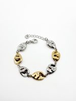 Ένα εντυπωσιακό βραχιόλι που συνδυάζει ασημένιους και χρυσούς τόνους με ρευστές, οργανικές φόρμες. Οι μεταλλικές πέτρες δίνουν μια μοντέρνα αλλά φυσική αίσθηση, ιδανικό για layering ή για να φορεθεί μόνο του ως statement piece.